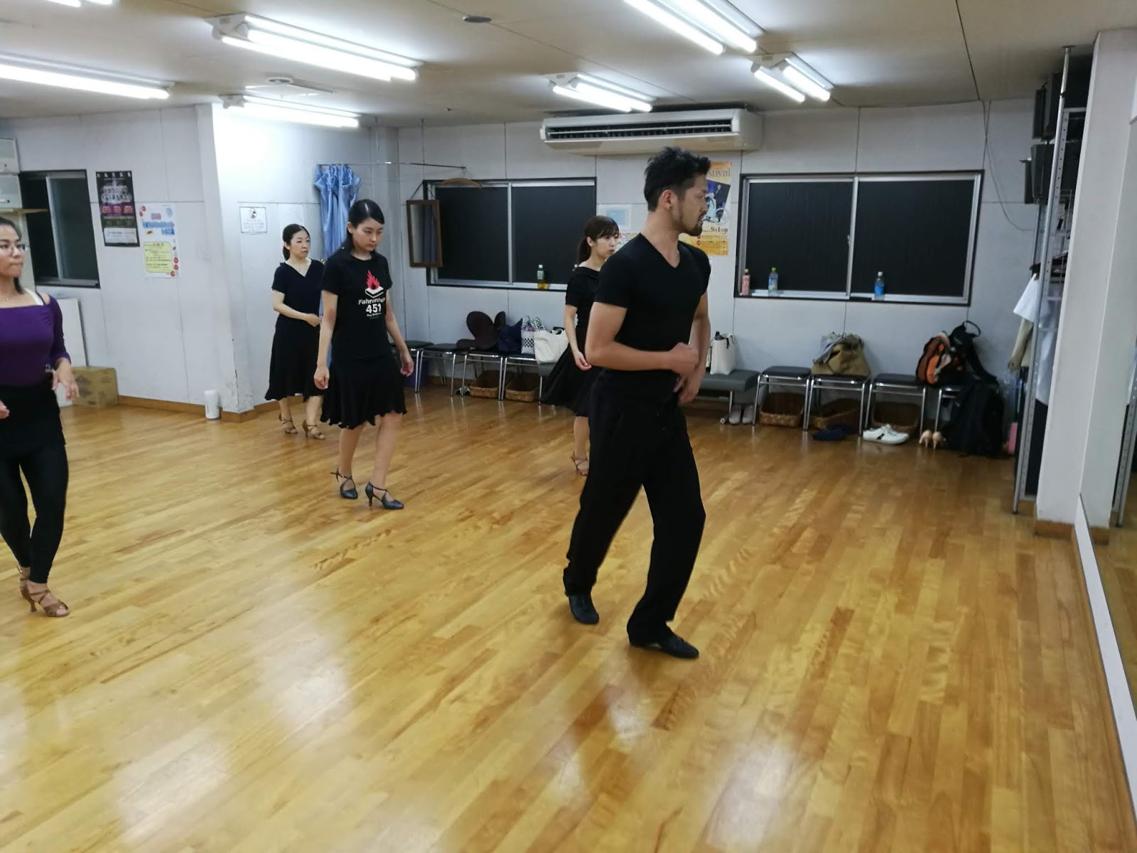 パートナーは、右手をがっちりリーダーの腰に回し、反り返ることなく、リーダーの右後方に突っ切ることが重要とのこと。